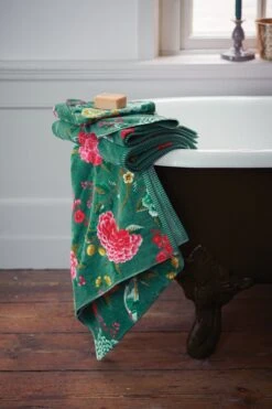 Wrap yourself in this comfortable coral set of three Good Evening towels. The stylish Good Evening bath linen collection will look truly elegant in any bathroom. The bath towels feature a print of elegantly drawn oriental flowers. A bird and a butterfly flit among the blooms. The print includes the colours yellow, blue, green, pink, red, and white. It has blue green-and-blue striped trim. The Good Evening bath linen series pairs beautifully with the other series by Pip Studio, which creates a lovely mix-and-match effect in your bathroom.