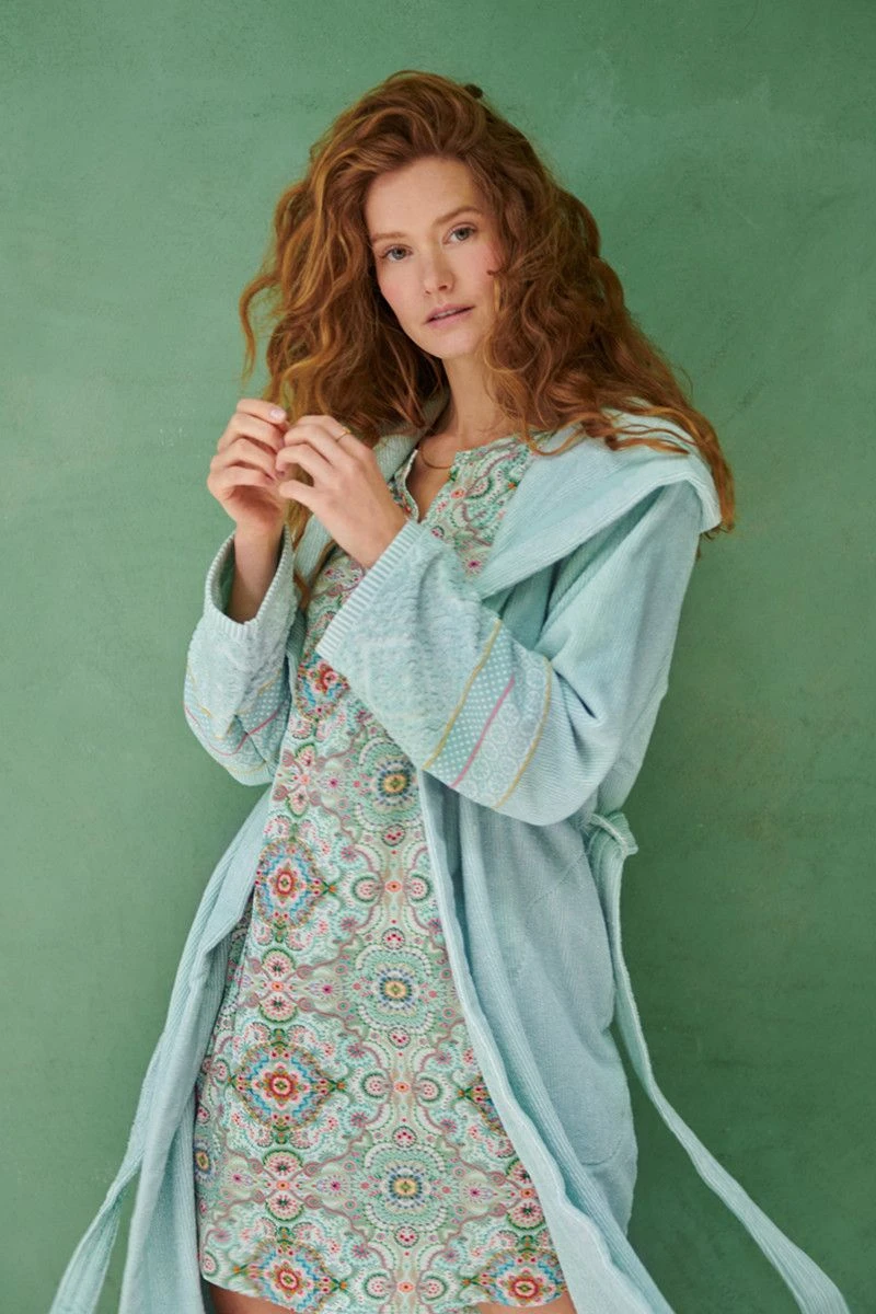 This long blue bathrobe with fine stripes is from the Soft Zellige collection. The sleeves are finished with pink and yellow piping and a jacquard pattern. The bathrobe has side pockets and a hood. The bathrobe should be washed before use according to the care label.