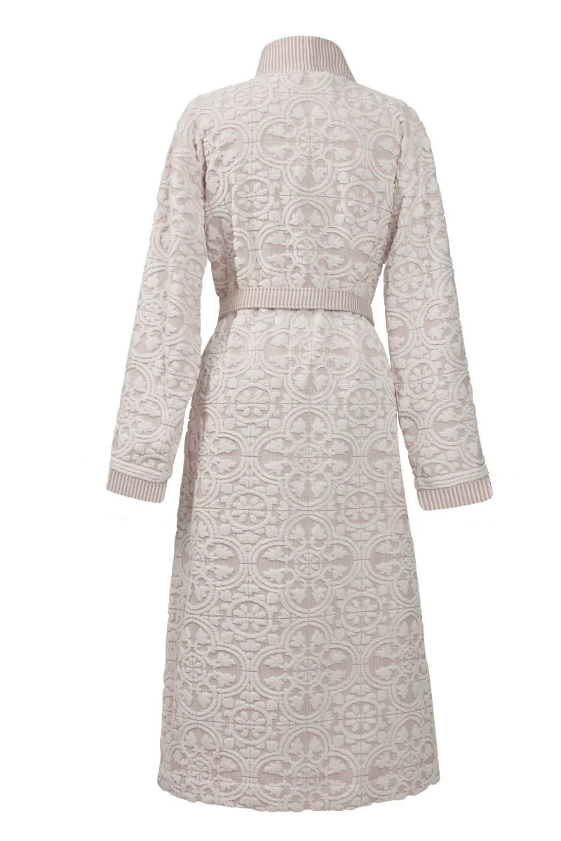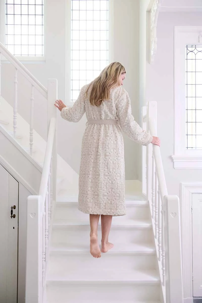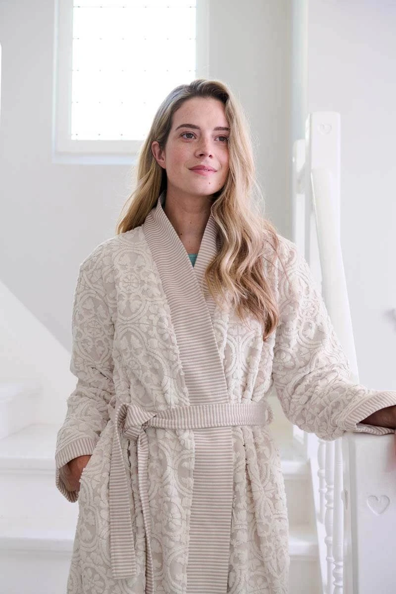 This khaki Tile de Pip bathrobe is great to wear in the morning or at the end of the day. Decorated with a tonal, woven tile print with high-low effect. The bathrobe has a stitched collar, slit pockets, and a long belt. The bathrobe is made from 100% high-quality cotton terry velour with a quality of 380 gr/m2.