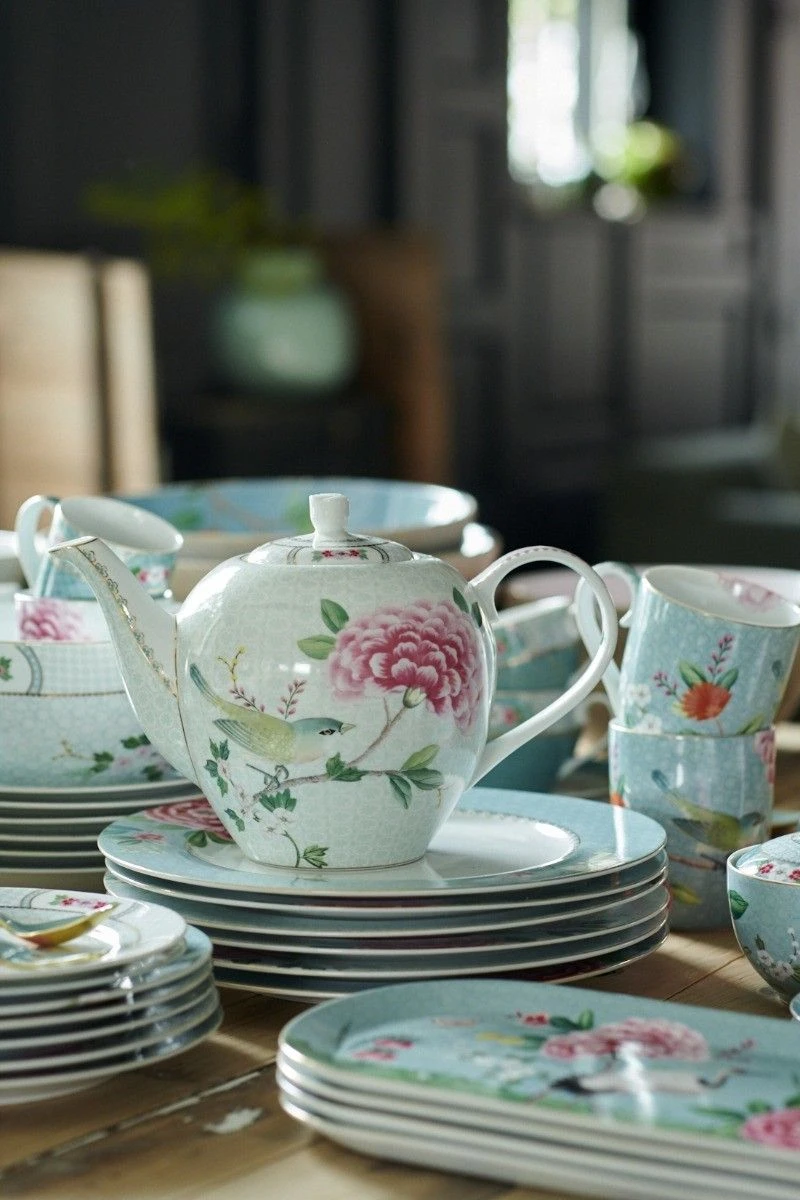 This dinner plate is made of high-quality porcelain and decorated with exotic flowers. The edge has an elegant design as the background and golden details. Combines beautifully with the other dinner sets in the Blushing Birds collection.