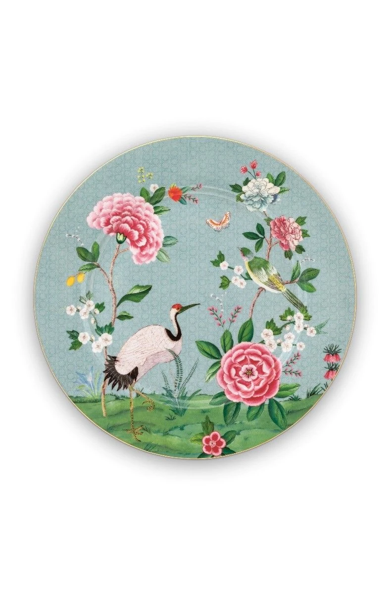 This blue underplate is richly decorated with exotic flowers, birds and golden details. The background has an elegant design. Combines beautifully with the other dinner sets in the Blushing Birds collection.