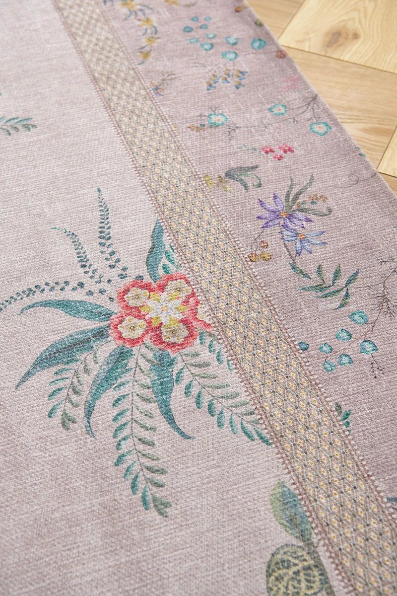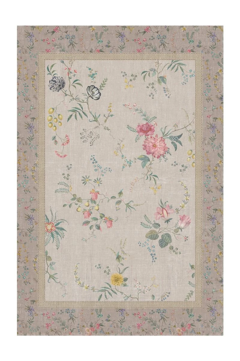 The khaki Fleur Grandeur by Pip carpet with border has a wonderfully fresh-looking design. The design of this Fleur Grandeur by Pip carpet with border consists of fanciful flowers and elegant flower branches with Dahlias, fresh blue cornflowers and a scattering of summer fruits. The pastel soft, light colours in this colourful design gives this carpet an extra luxurious look. The carpet is decorated all around with a beautiful khaki border en due to the soft and cheerful colours it is a refreshing item in your interior. The rug is printed and can be combined in many interior designs. In addition to the colour green, the Fleur Grandeur by Pip carpet is also available in blue/khaki, green and pink. Which colour will you choose?