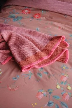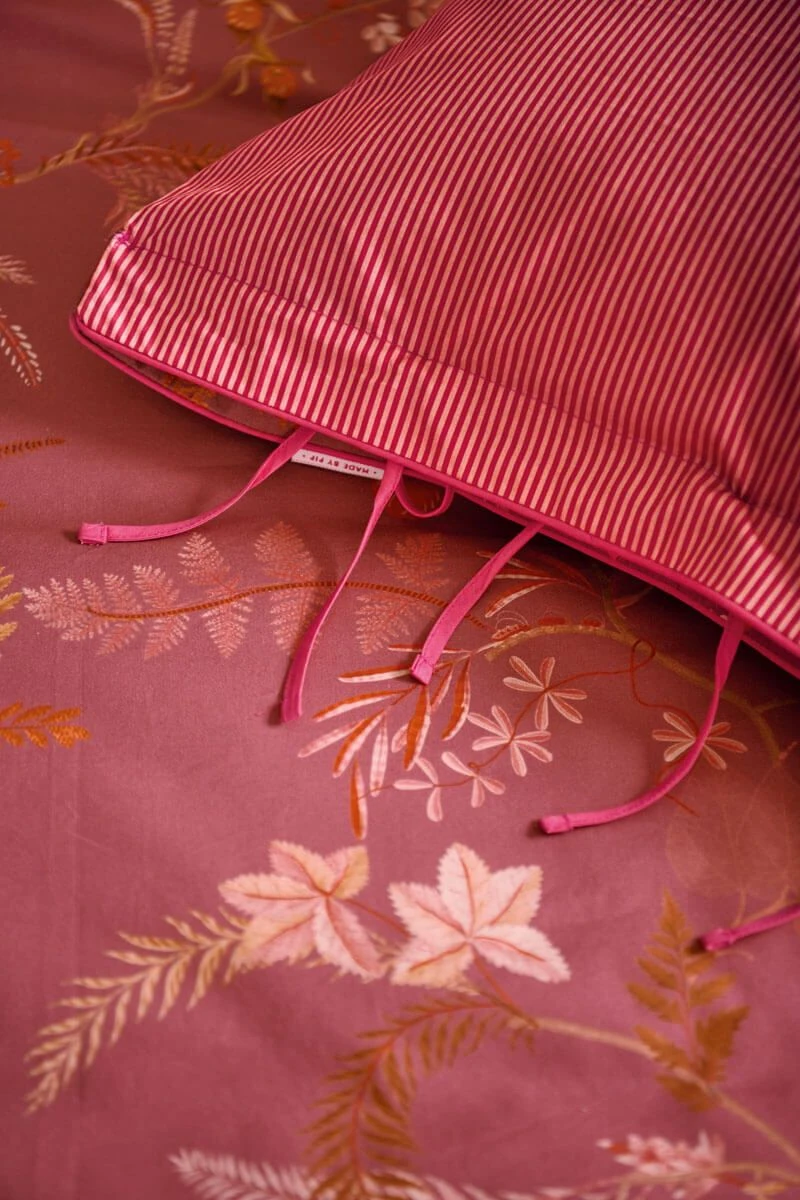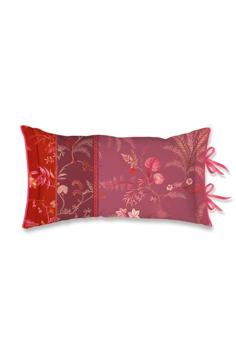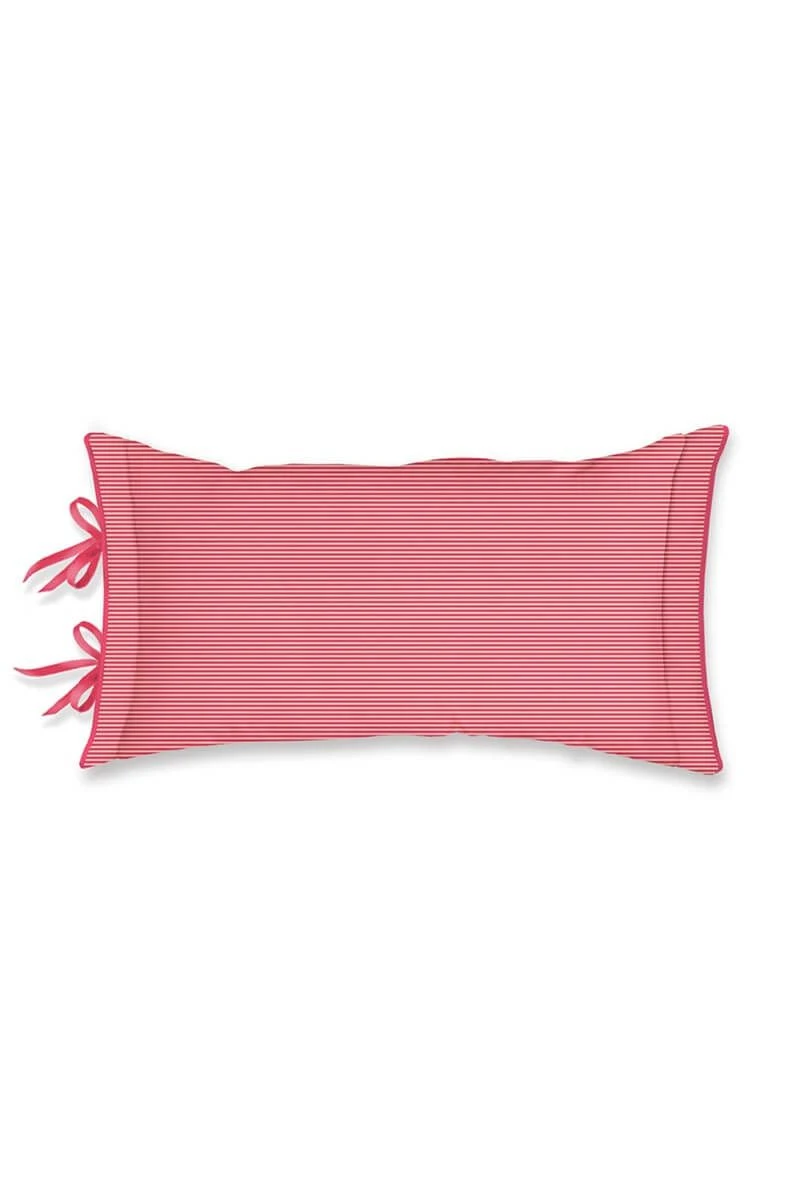 The pink Isola decorative pillow owes its distinct character to a tonal print of detailed palm trees and ferns in different colorful stripes. The back has horizontal red and pink stripes. The decorative pillow has a quilted oxford border on the sides with a unique bow closure, giving it a luxurious look. You can use the pillow on both sides.