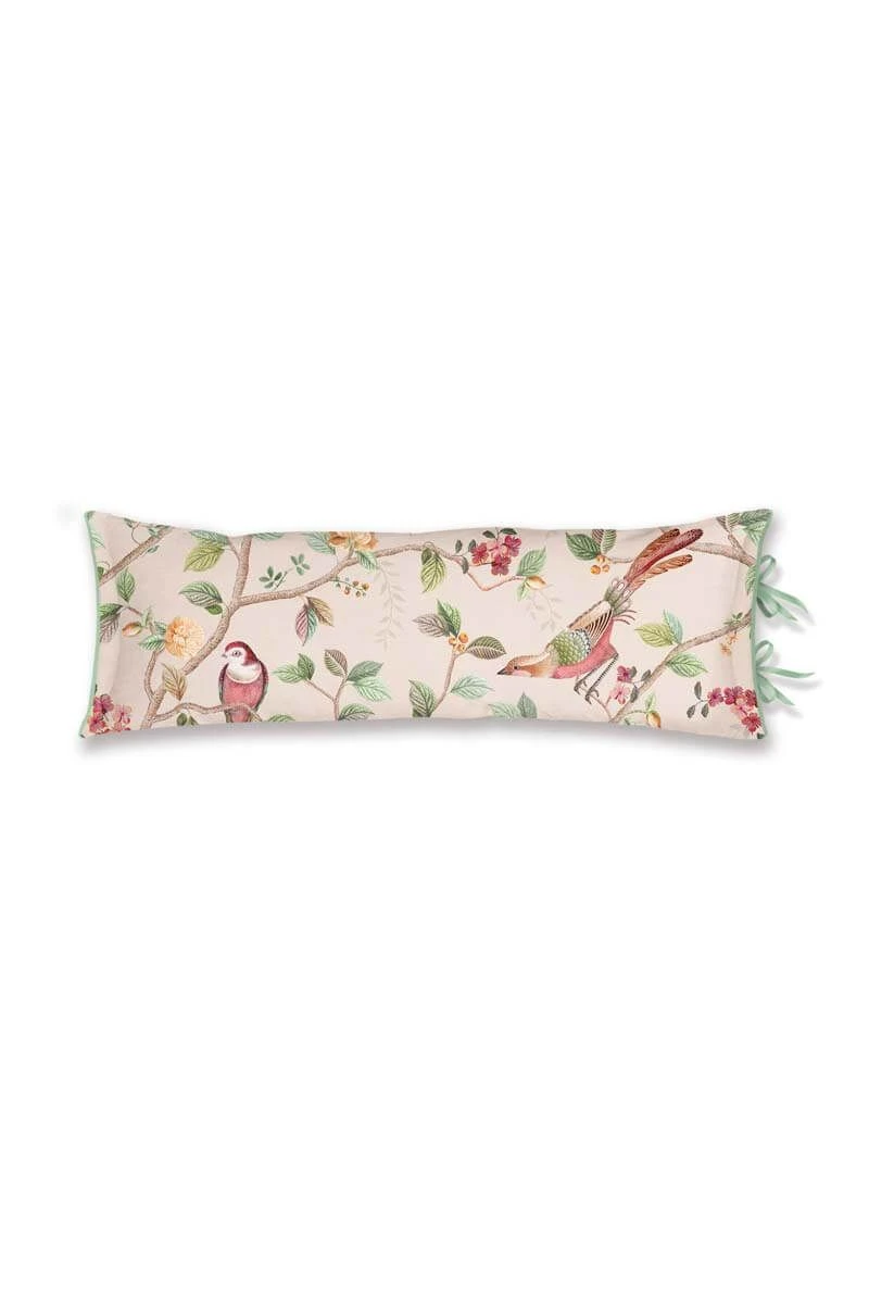 In the cheerful design of the decorative pillow Good Nightingale, unique species of birds hide among branches and flowers. Each bird has an imaginative plumage with dots and stripes. The subtle dot pattern on the background gives the design extra depth. The back has sand-colored horizontal stripes. The decorative pillow has a quilted oxford border on one side and a unique bow closure on the other side. The pillow can be used on both sides.