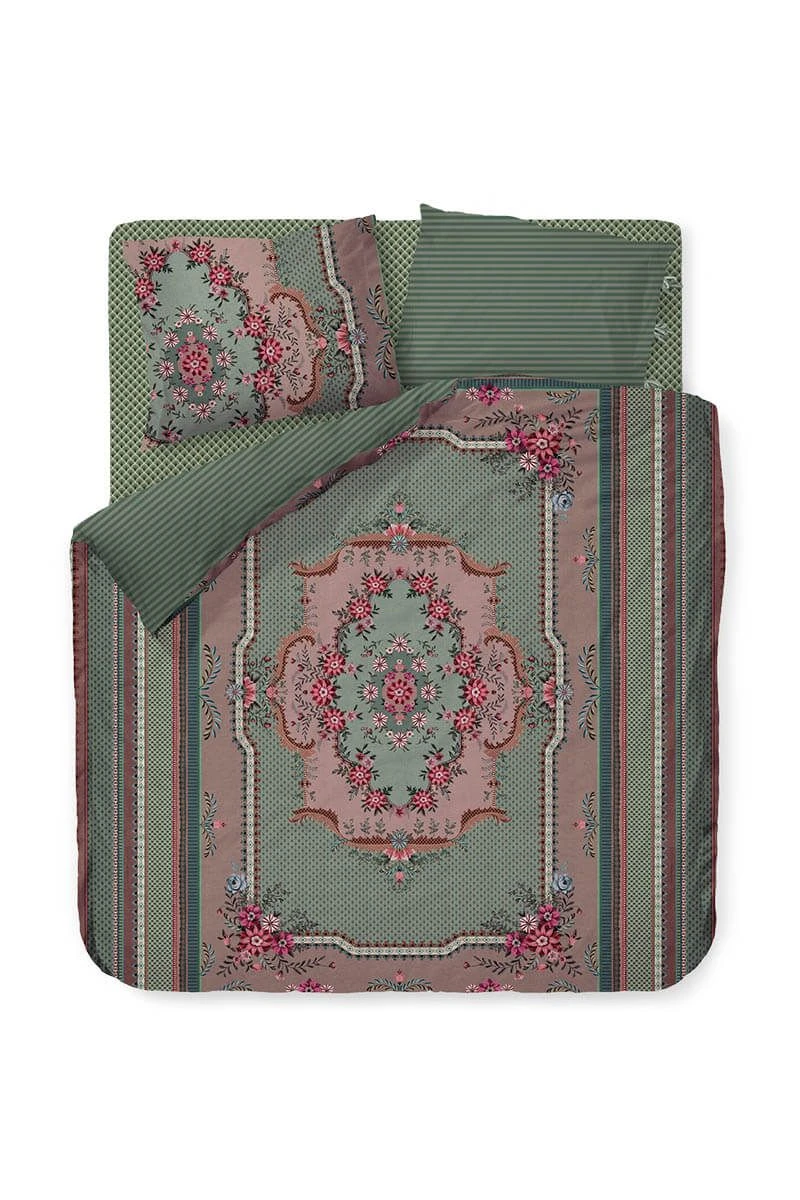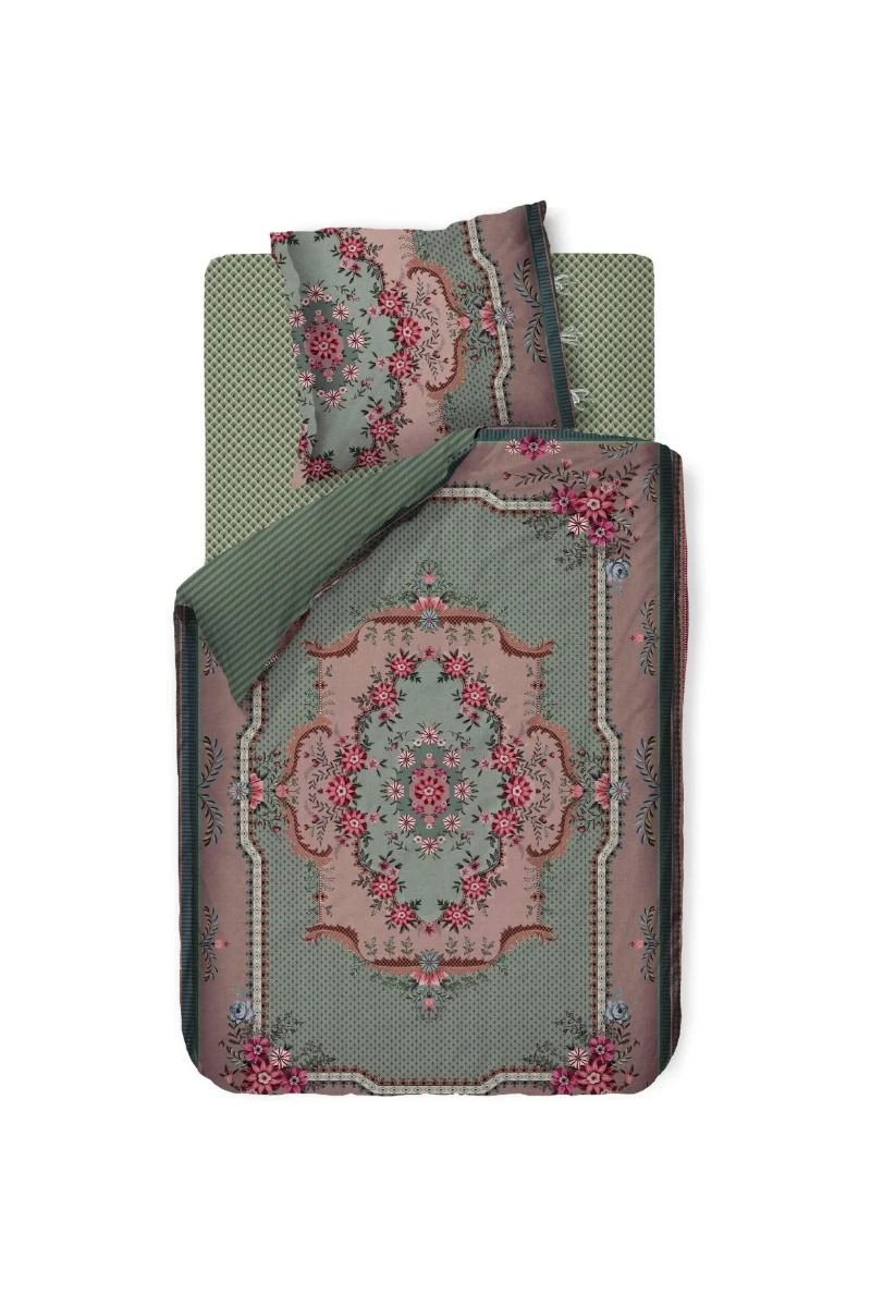 This beautiful green duvet cover is decorated with the Pip Chique design. This print is inspired by classical carpets and consist rosettes, fantasy flowers and a variety of arches, checks and vertical stripes. The duvet has an oxford edge and tie closure. The back is printed with a striped design, so the duvet can be used on both sides.