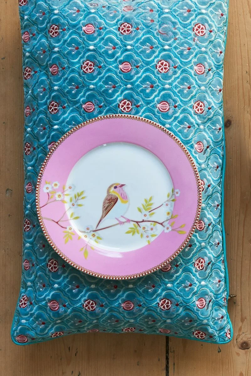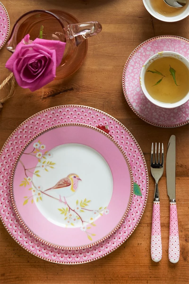 For this breakfast plate, we worked with a base of calm colours, so that our refined Early Bird illustration with lovely cherry blossom takes centre stage. It’s adorned with our famous red-white stripe with gold details.