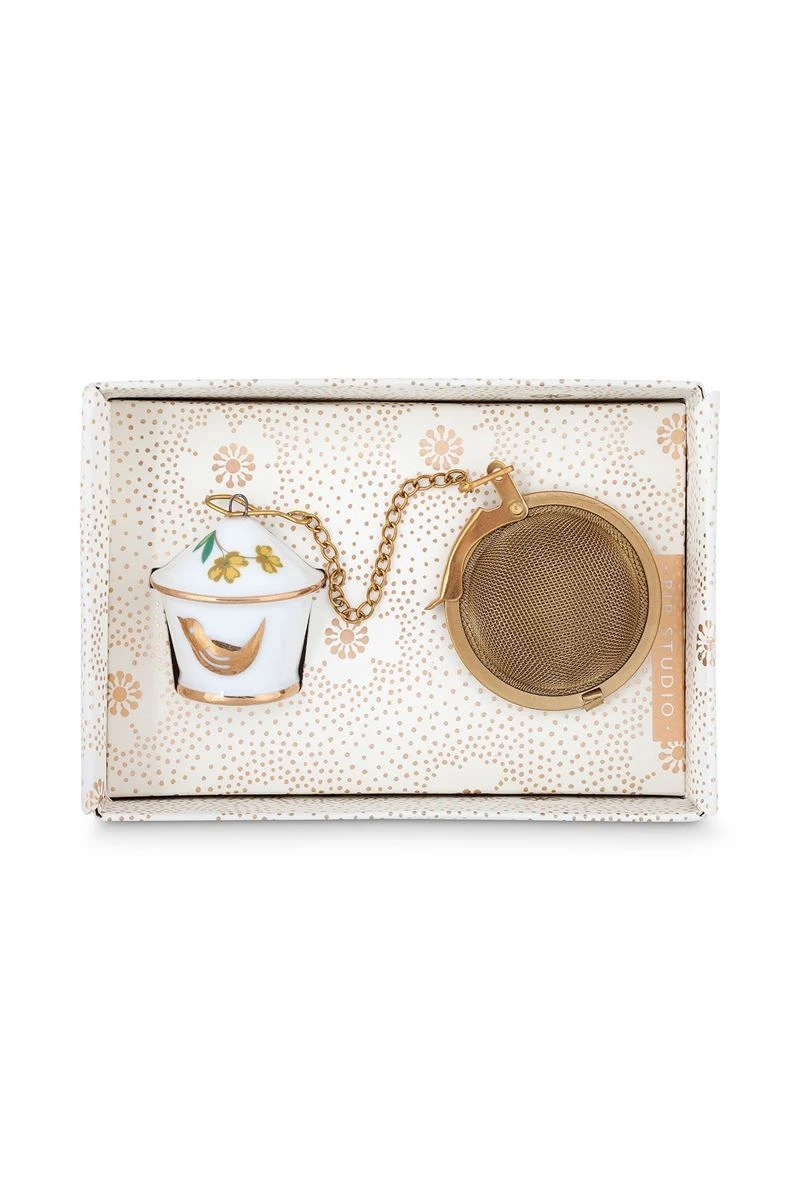 We all enjoy taking a moment out of our busy lives to enjoy a cup of tea. With this in mind, we designed this infuser as part of our Floral porcelain set. The base is gold in colour with a porcelain hanger, shaped like a bird feeder. The infuser is presented in a gift box.