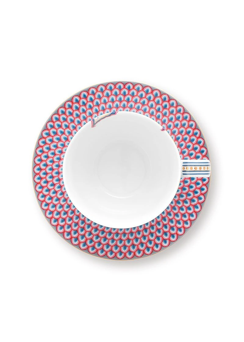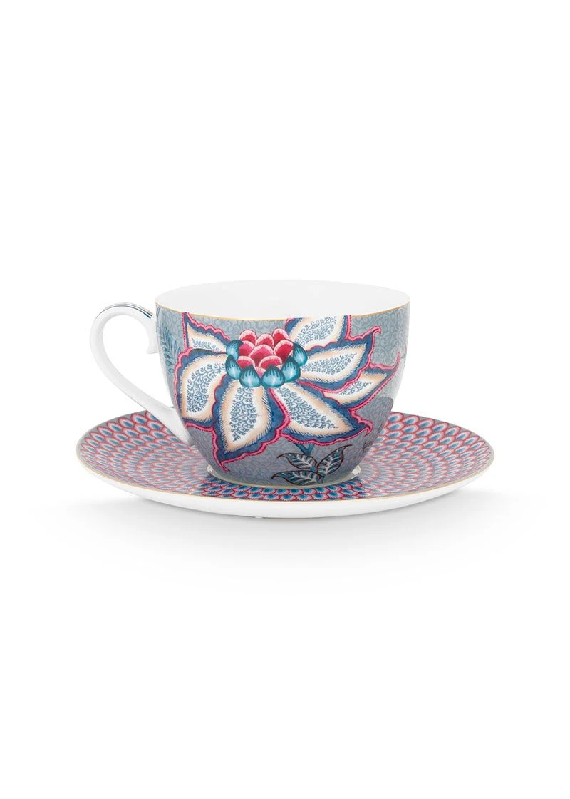 Add this Flower Festival cup & saucer to your porcelain collection. This cup & saucer has a blue background and are decorated with the elegant Flower Festival design. This rich floral pattern features a variety of fanciful red and pink chintz flowers with light blue and green leaves. The playfully positioned flower branches with elaborately decorated flowers and leaves give this elegant design an extra luxurious look and feel. Our Flower Festival porcelain will make your china cabinet and table shine.