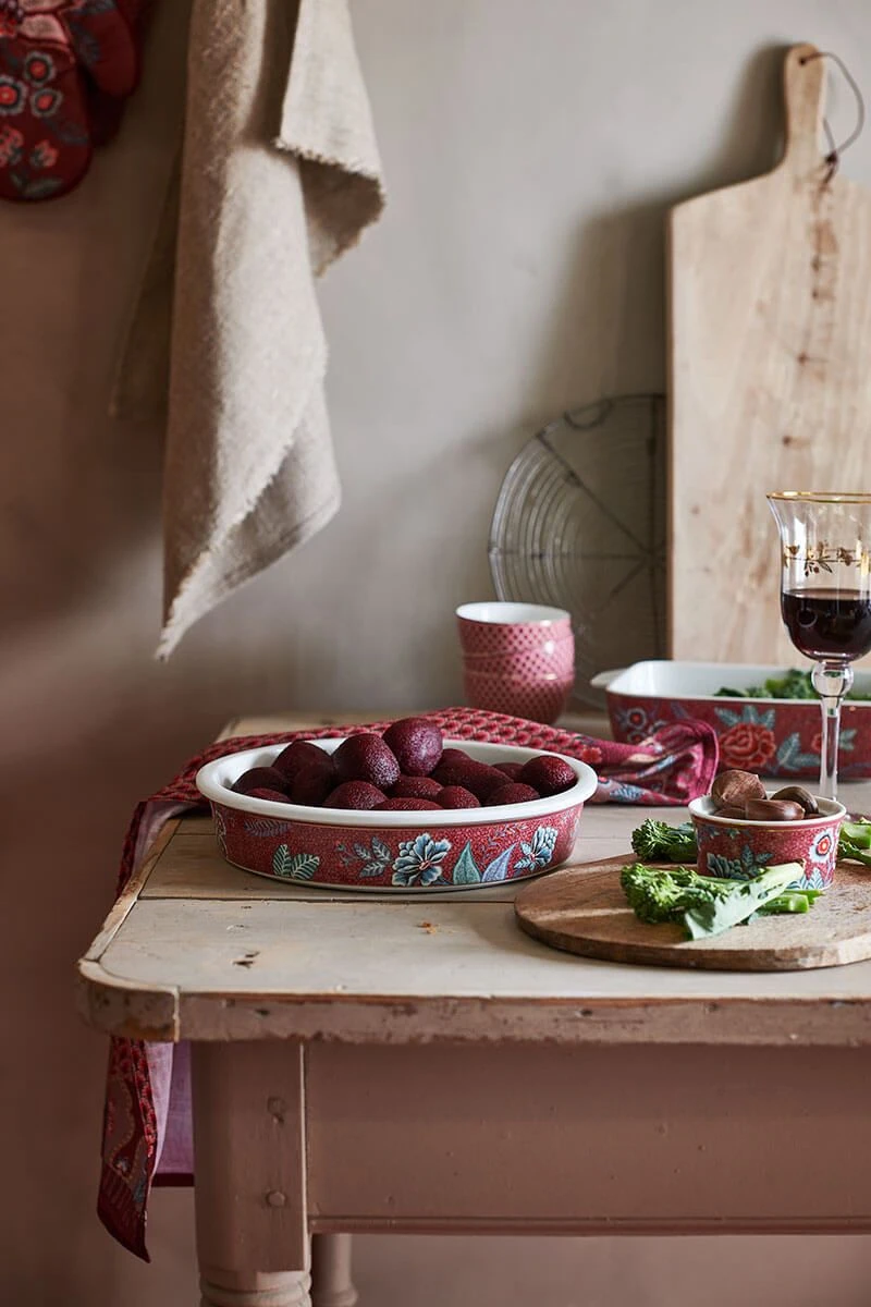 Bake your dishes in this cheerful baking dish from the Flower Festival collection . The baking dish has a floral design with imaginative red and pink chintz flowers with light blue and green leaves.