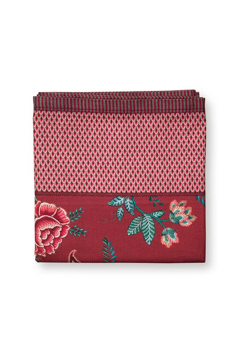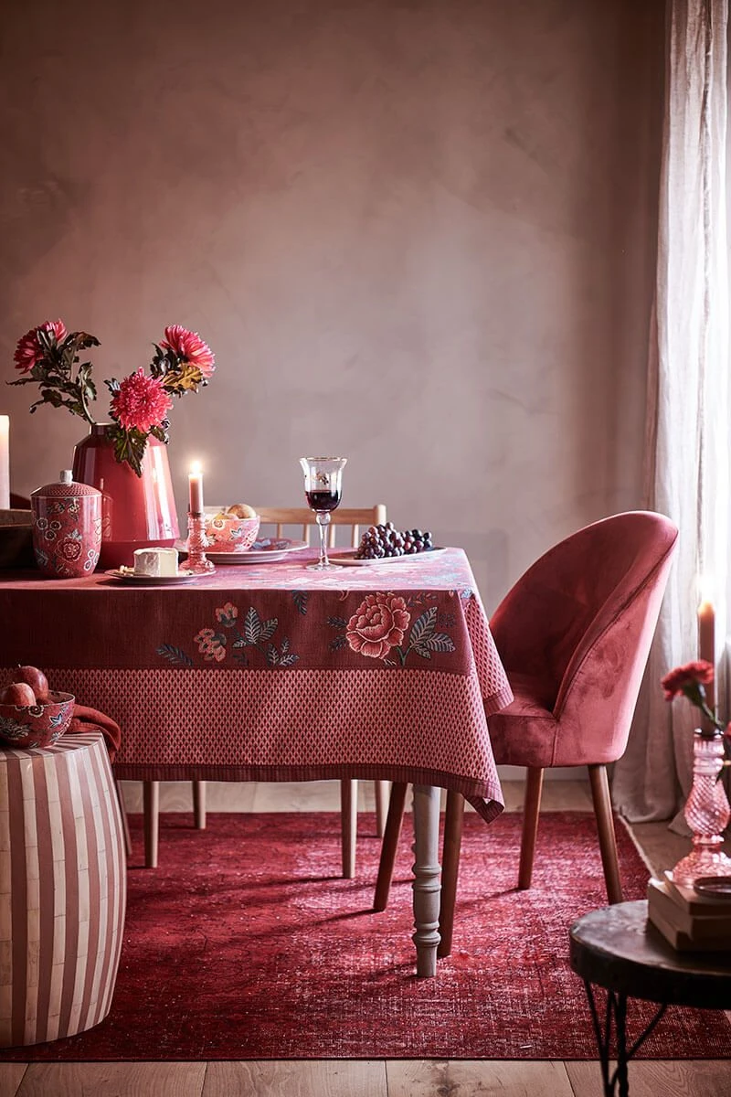 Expand your kitchen textiles with this tablecloth from the Flower Festival collection . The tablecloth has a floral design with imaginative red and pink chintz flowers with light blue and green leaves combined with a scallop design.