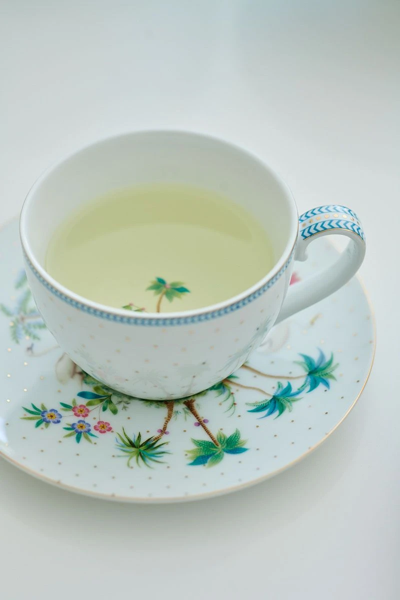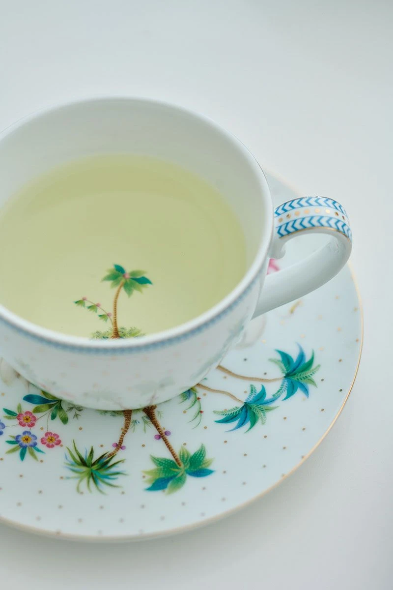 This white cup & saucer set will take you on a trip to a trpoical island with its tropical design. The cups are decorated with an exotic design. The saucers are decorated with golden dots and have blue details.You will find various plants, colorful flowers an species in here. This set has te perfect size for a delicious cup of coffee.