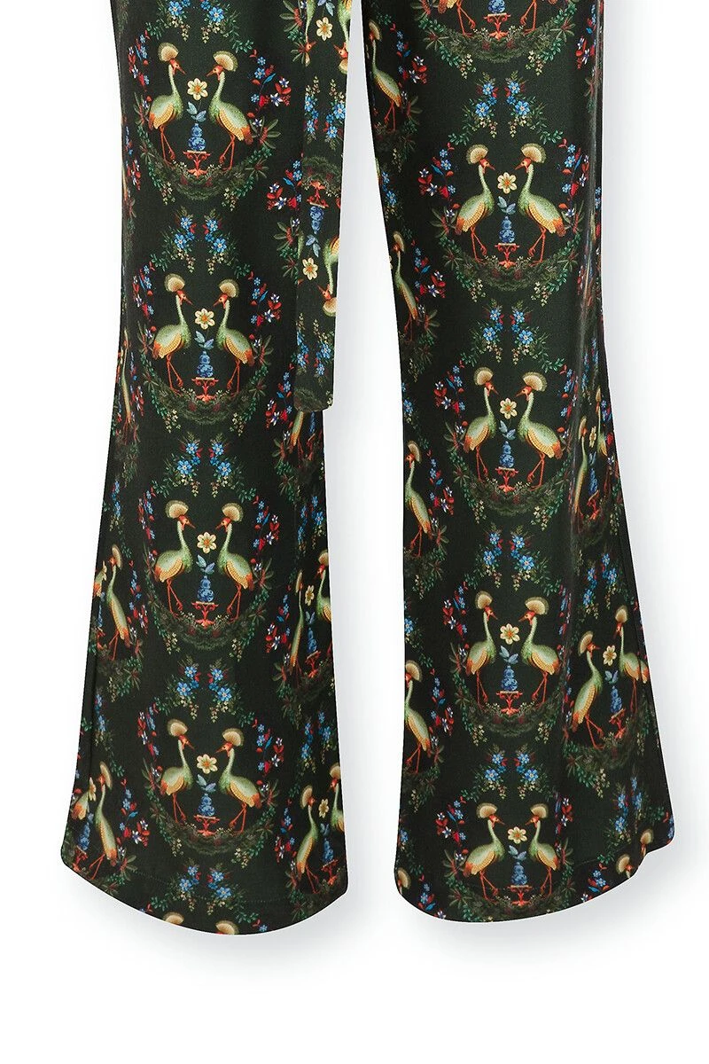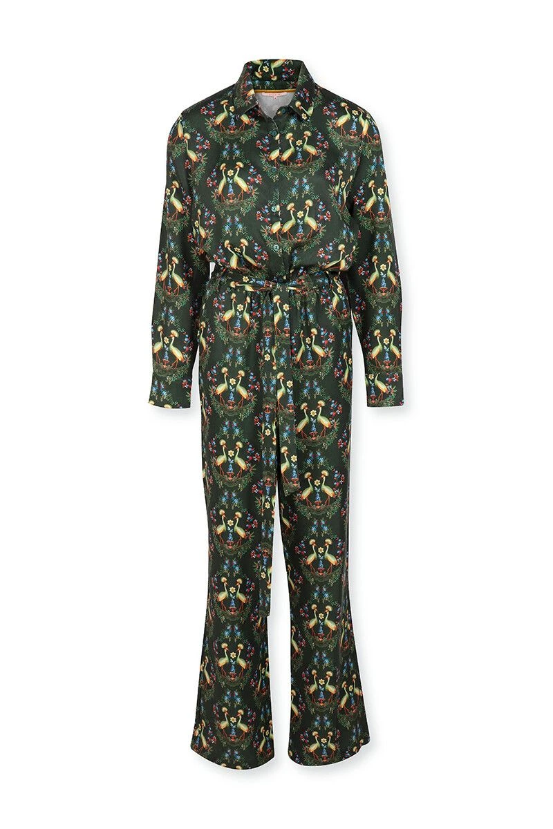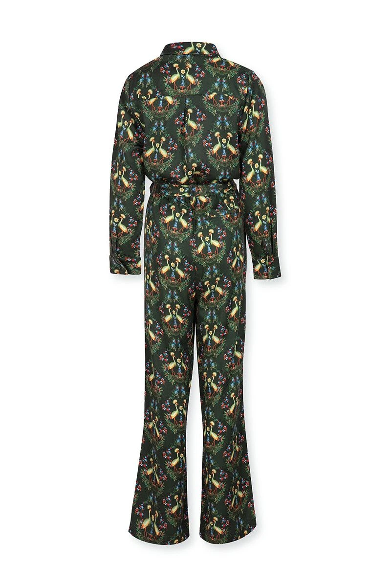 Give your wardrobe a colourful and elegant twist with this stylish jumpsuit of Pip Studio. A jumpsuit is an easy item for a special occassion but also very comfortable for weekdays. Get enchanted by the beautiful Flirting Birds design, which is decorated all over the jumpsuit. This beautiful, luxury symmetrical Flirting Birds design consists of various exotic flowers and plants in which two cranes are portrayed. The deep and rich colours form a beautiful whole on the dark background. The jumpsuit is made of 95% Polyester and 5% Elastane which makes it very soft.