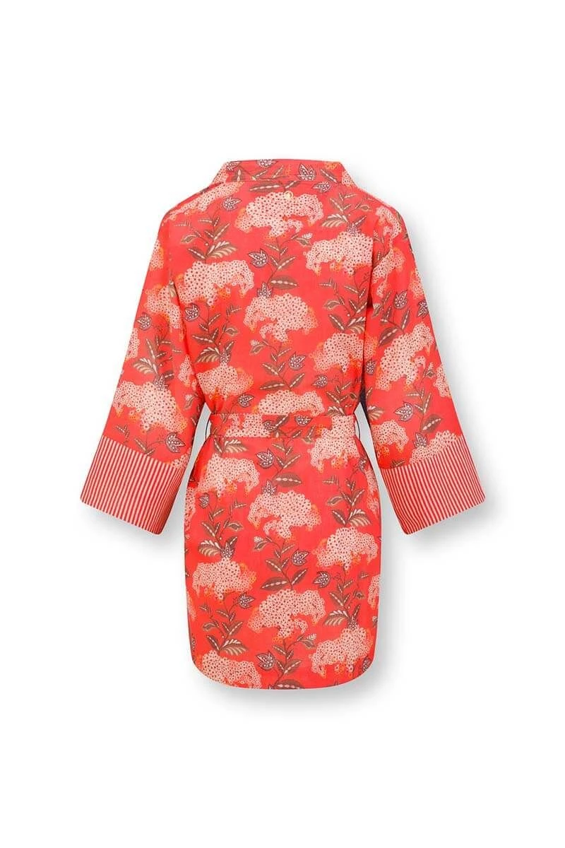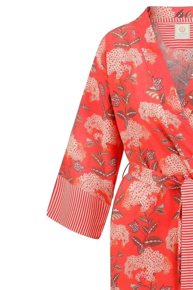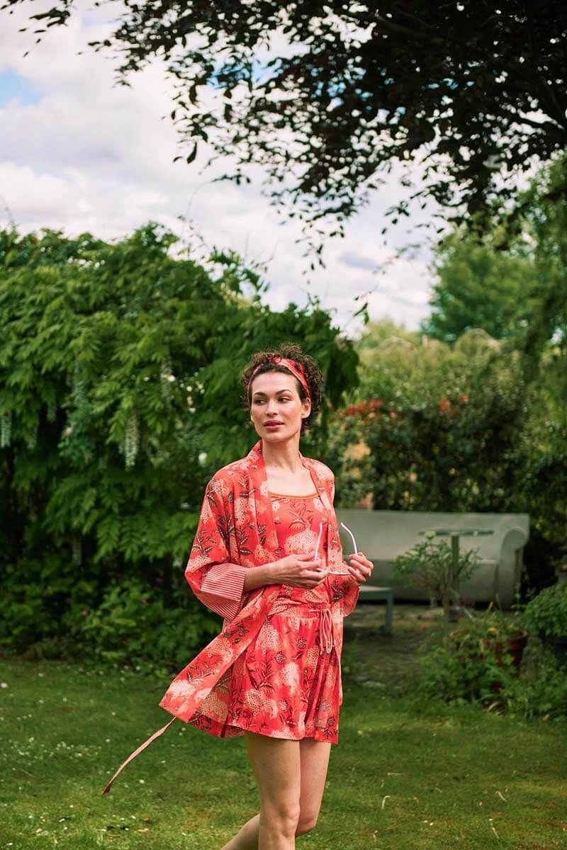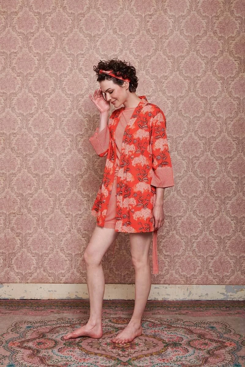 The short kimono is your summer must-have! The beautiful floral print Flora Firenze immediately brightens up your day. The cuffs and belt are finished with Little Sumo Stripe design. Imagine yourself on a sunny day on the terrace. This coral pink kimono will take you to those summer dreams and is perfect for all occasions.