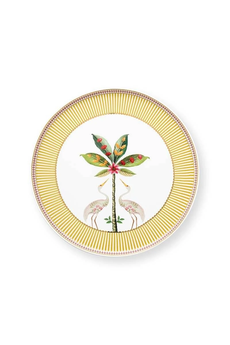 Complete your collection with the La Majorelle cake platter. The yellow cake platter is decorated with the cheerful La Majorelle design. This design features an exotic palm tree surrounded by two herons. The edge of the cake platter is adorned with yellow and white stripes that give the design an elegant flair. Our La Majorelle porcelain will make your china cabinet and table shine!