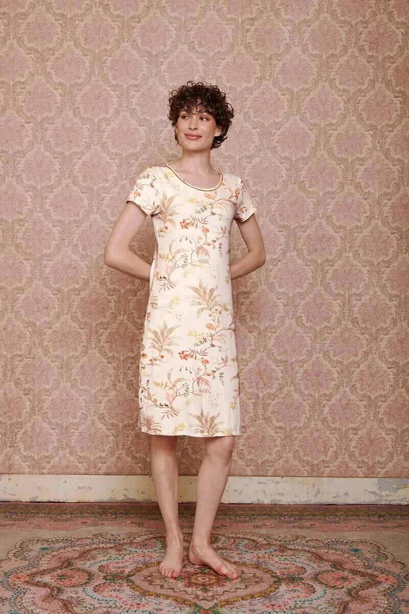 This nightgown in white is decorated with the playful Isola design. The playful design has a refined print of multi-coloured twigs and ferns. The colors of the nightgown are soft with subtle color accents. The nightgown has short sleeves.