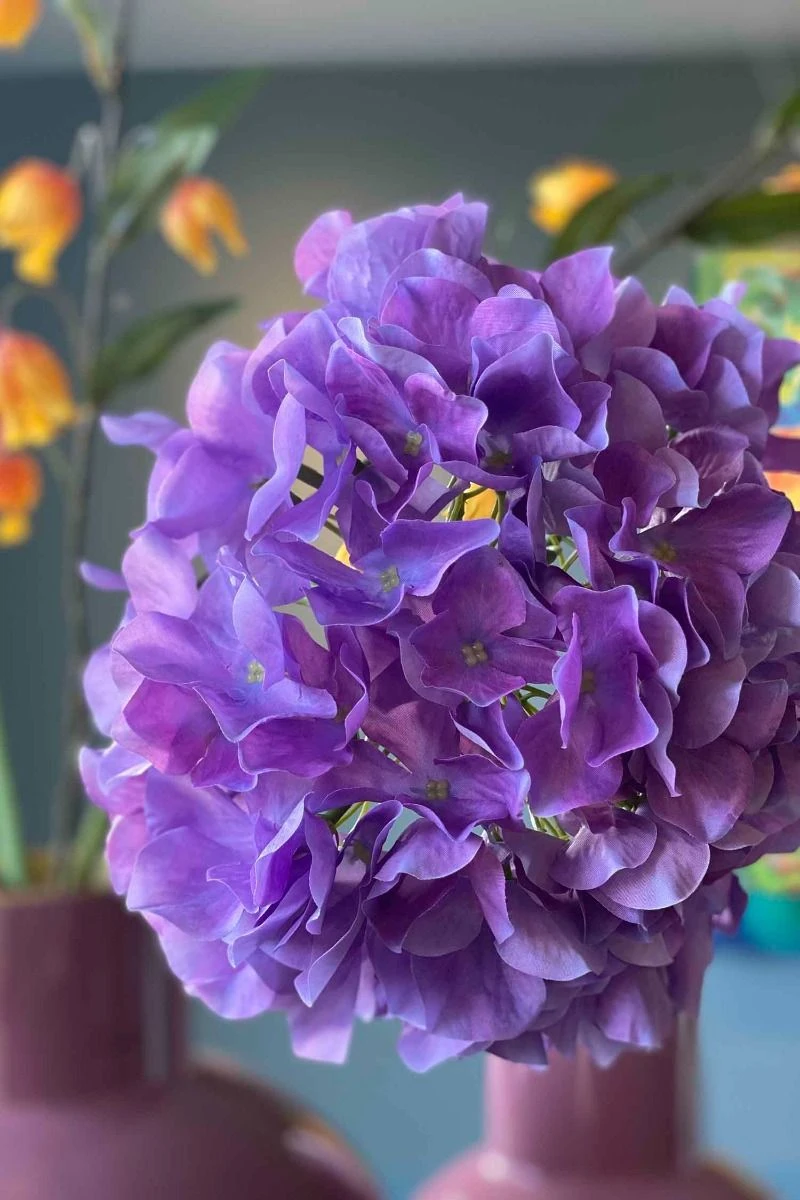 The perfect colourful gift to delight yourself or a loved one. Ultimately ideal to enjoy for a long time. Bend the stems to use the flowers in a small vase. The bouquet is made of silk and composed of a steel of a Hydrangea, a Lupine steel and a sandersonia.