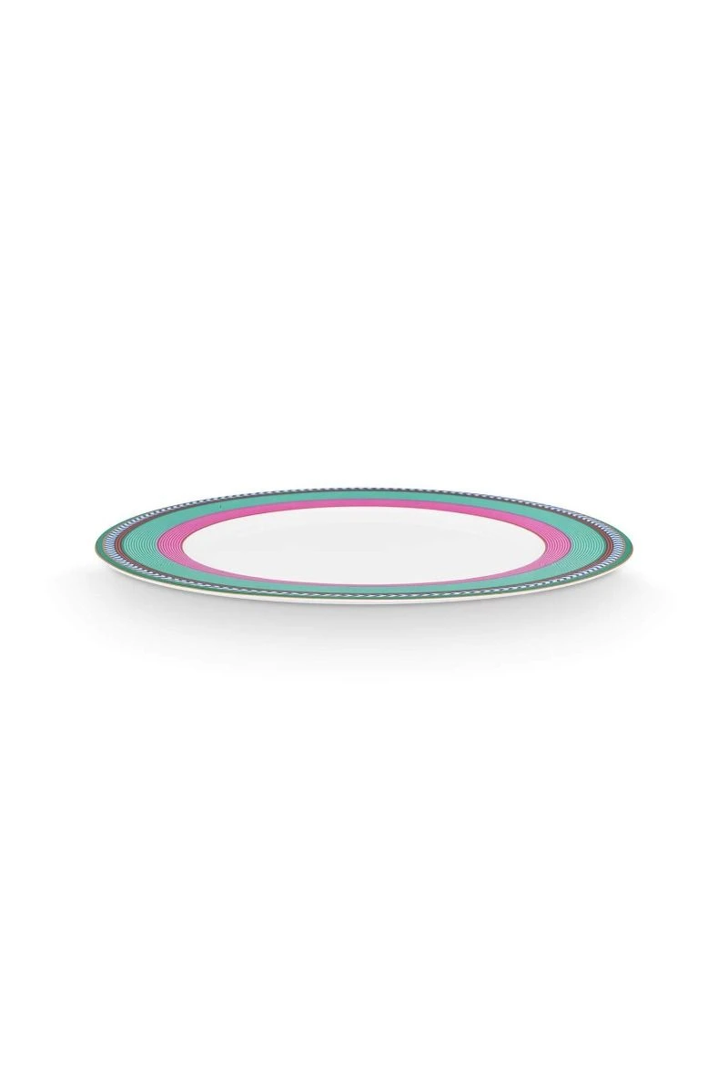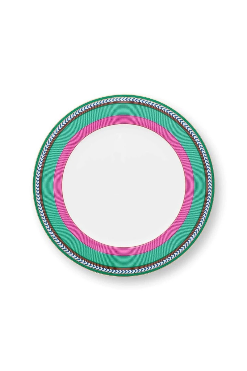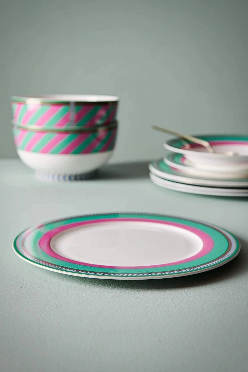 This dinner plate has a pink and green striped design with a white background in the centre. The plate is finished with golden details and blue and white diamond shapes and perfect to mix with the other plates of this collection or our Royal Stripes collection. The Porcelain is made of bone China, a high-quality thin porcelain with a sophisticated design. Also available in sizes: 23 cm, and 23.5 cm. Have a look at the full Pip Chique Stripes collection for more inspiration.