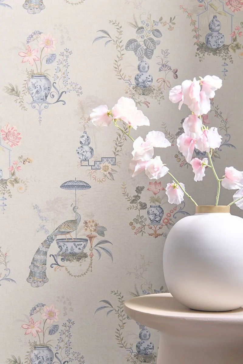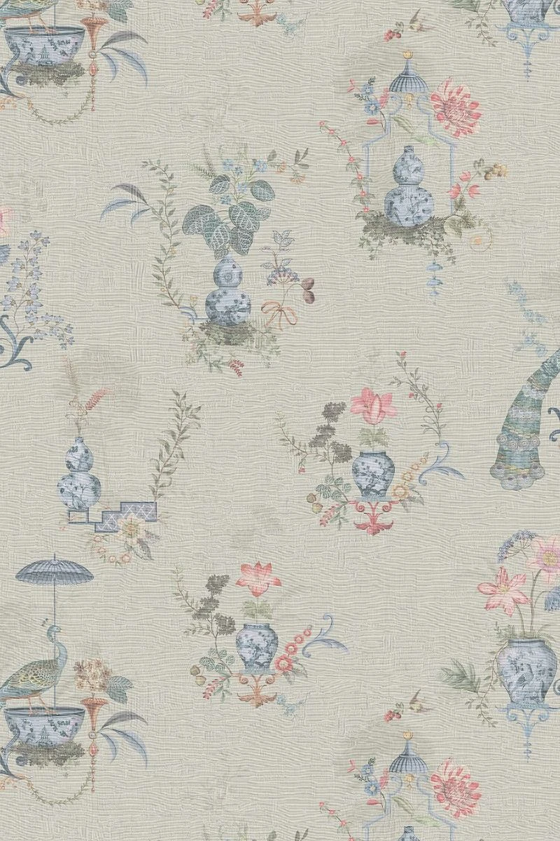 Give your home a magical make-over with this stunning Chinese Porcelain wallpaper in the colour sand. This design consists of small scenes in which porcelain vases play a leading role. The decorated vases are filled with elegant flowers and curly branches and surrounded by little gazebos with cranes, white herons and fanciful peacocks. The Saluti wallpaper is available in different colours: light blue, light green, mauve, dark green and dark blue. This design is printed on a non-woven surface with a vinyl top layer.