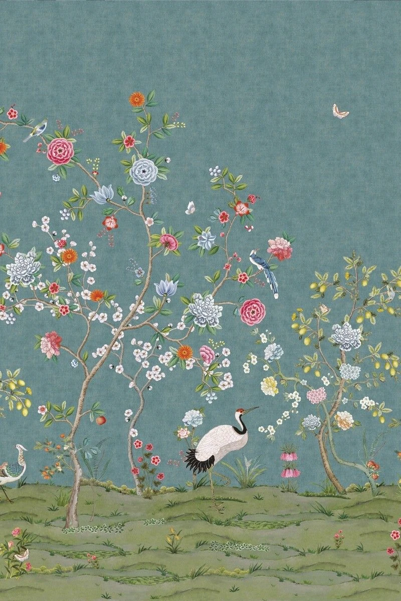 Enrich your room with the Good Morning Dark Blue wallpower. Its print features a décor of exotic flowers and birds inspired by classic India.