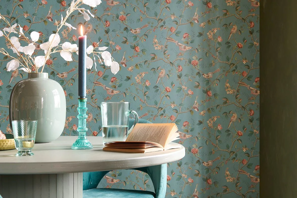 Give your home a magical make-over with this stunning Good Nightingale wallpaper in the colour petrol. If you’re a real bird lover, the Good Nightingale collection is the perfect choice! Among the branches and flowers of this cheerful design, all kinds of unique species of birds are hidden, each with fanciful plumage with dots and stripes in rich colours. Subtle metallic effects make this wallpaper a true eye-catcher. The Good Nightingale wallpaper is available in different colours: green, off white, ocher, dark blue, pink mauve and light blue/grey.