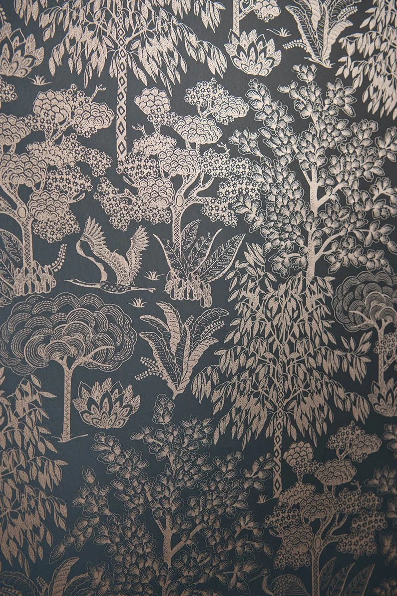 Give your home a magical make-over with this stunning Origami wallpaper in the colour dark blue/rosegold. The design has a repetitive pattern with stylised trees and birds. The matte background with metallic print gives the wallpaper a unique and sophisticated feel. The Origami wallpaper is available in different colours: light green/silver, ochre/gold, terra/rosegold and off white/silver.