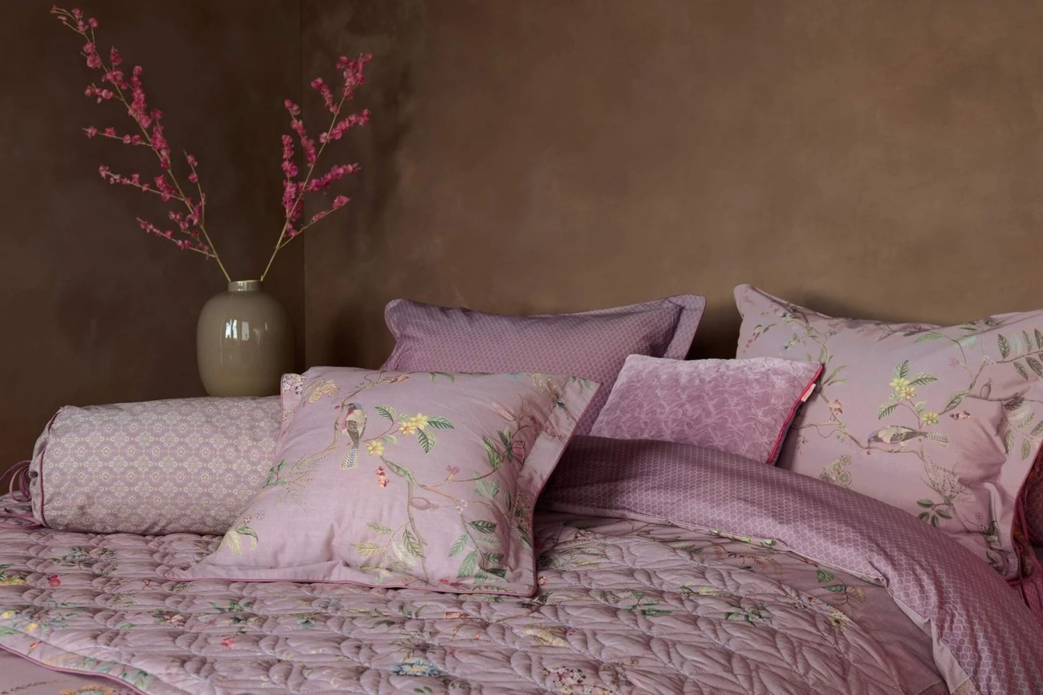 The flower design from the quilt Autunno consists of elegant branches on which fantasy flowers, berries, leaves and here and there a bird hides between the leaves. The flowers and leaves have surprising colour combinations, which give a modern twist to this classic design. The quilt has vertical bands with a small geometric print and a print of small leaves on the back. The quilt has a quilted oxford edge all around, which gives it a luxurious look. The quilt can be used on both sides and fits beautifully with the Autunno duvet cover. In combination with the Autunno quilted cushion you create the ultimate Pip mix & match effect.