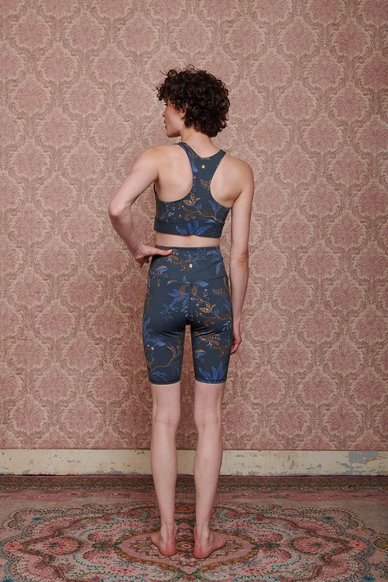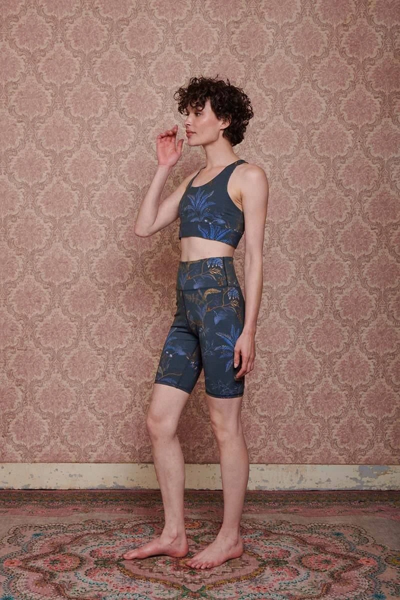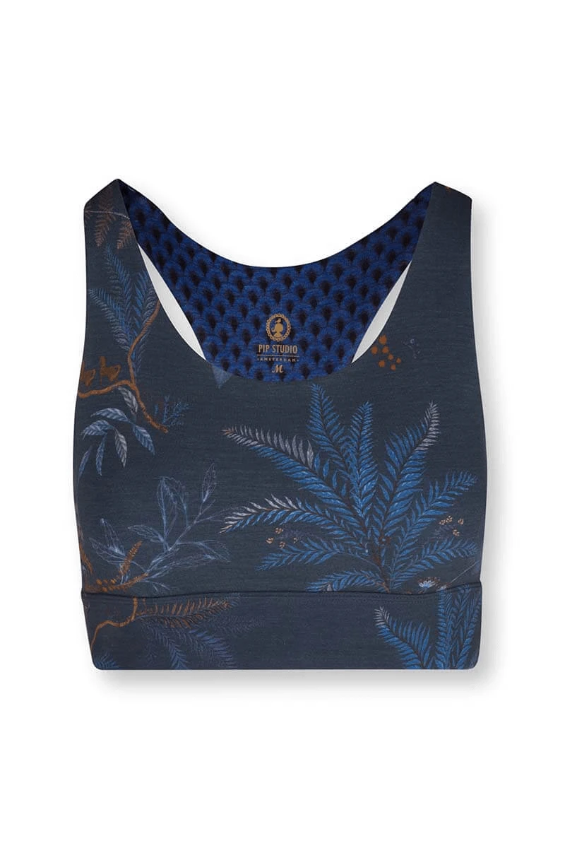 This dark blue sports bra features the playful Isola design. The print is made up of a refined print of multi-colored twigs and ferns. The inside is printed with the Suki design.