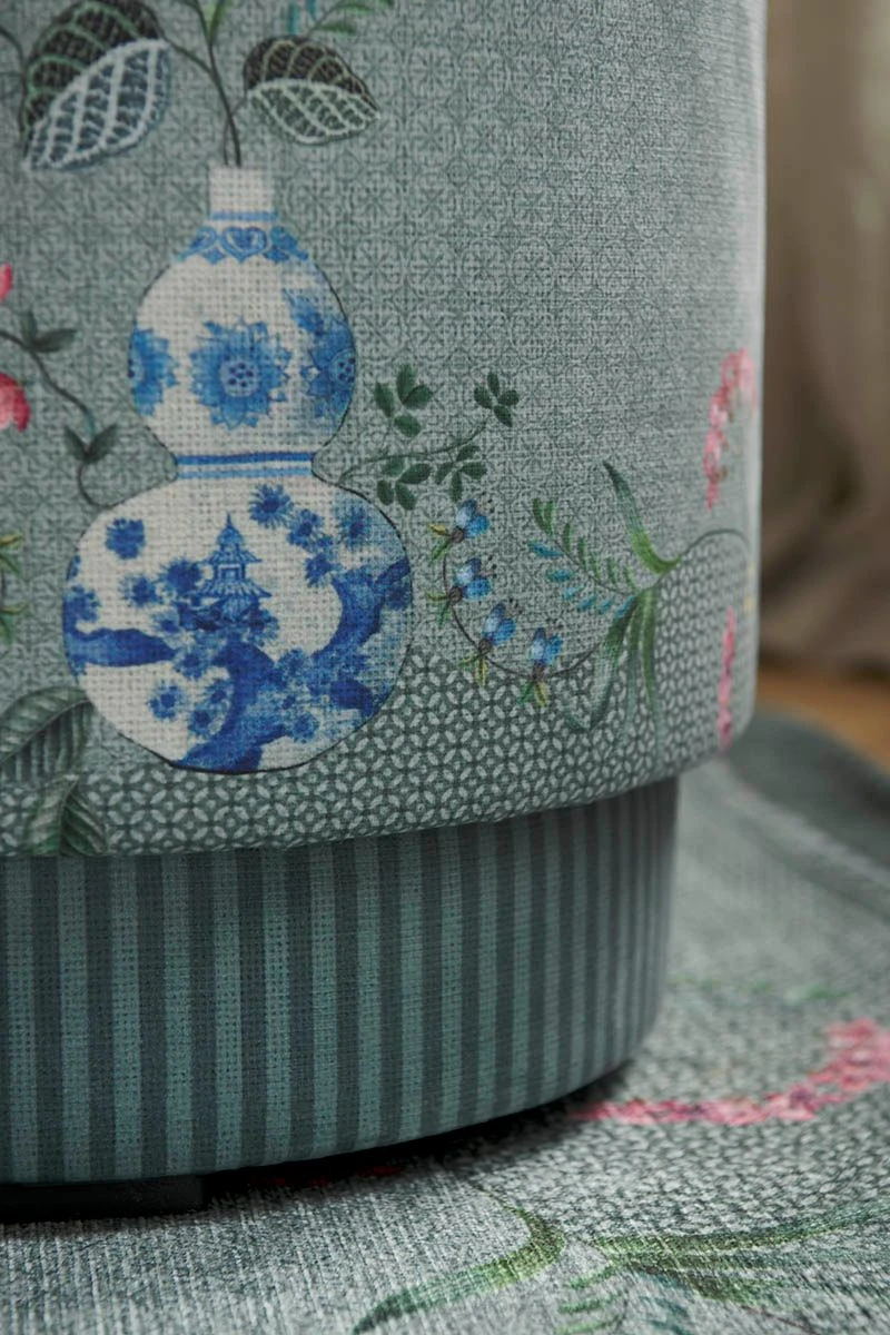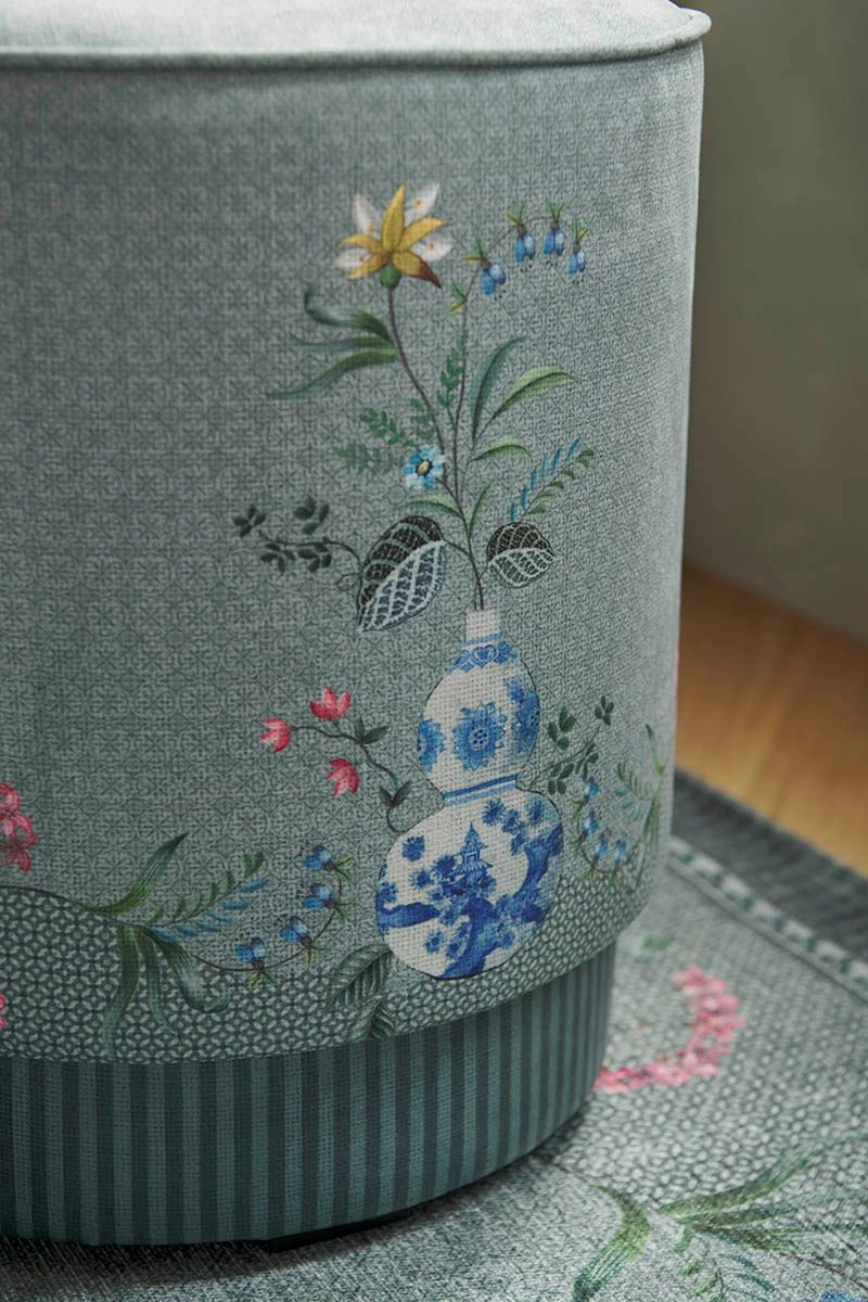 Decorate your home with this stool high Jolie green. The Jolie design features overall decorative scenes with two white herons and blue vases with plants and elegant flower branches growing out of them. The soft tropical colours in this exotic design give the stool a cheerful vibe. Combine the stool with the matching Jolie by Pip green carpet. Use the stool as an extra seat or comfortable foot rest.