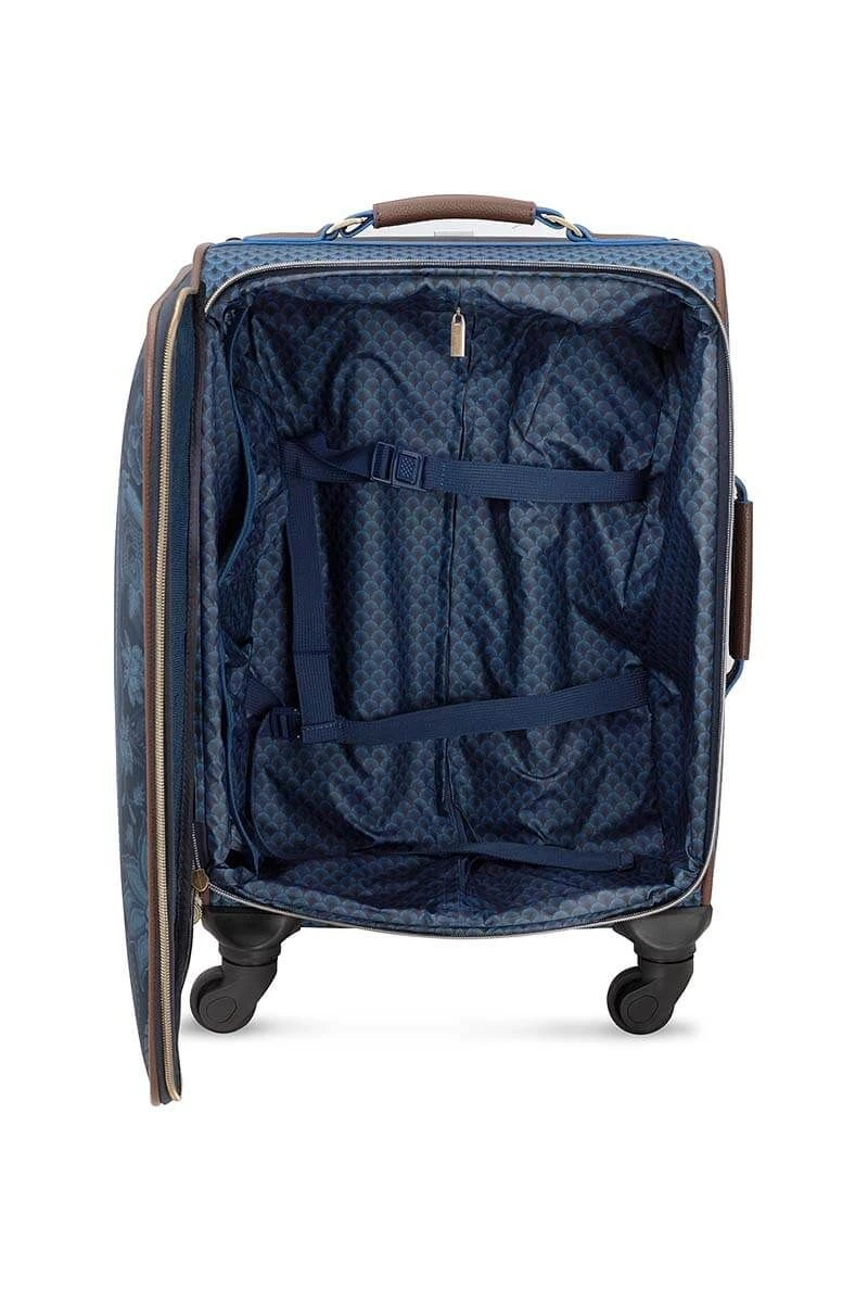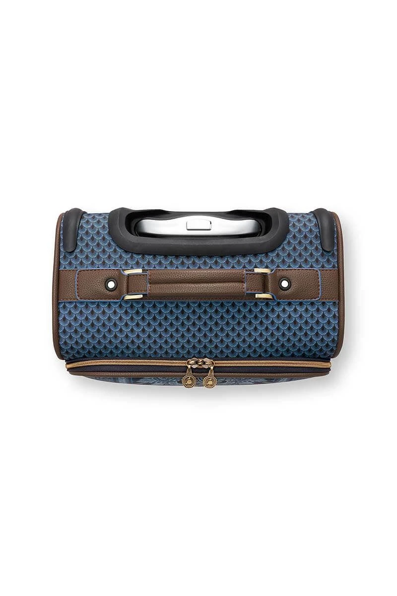 The new trolley on wheels in the color indigo blue with the Kyoto Fesitval design is a great trolley for traveling. This suitcase has a large storage compartment for your clothes and shoes, in which you can find 3 side pockets. One with a zipper and two with an elastic band. The outer and inner material are water repellent, so it is perfect for any weather forecast. At the bottom of the suitcase you will find 4 wheels, each of which can rotate 360 ​​degrees. The size of the suitcase makes it suitable for handluggage in the cabin.