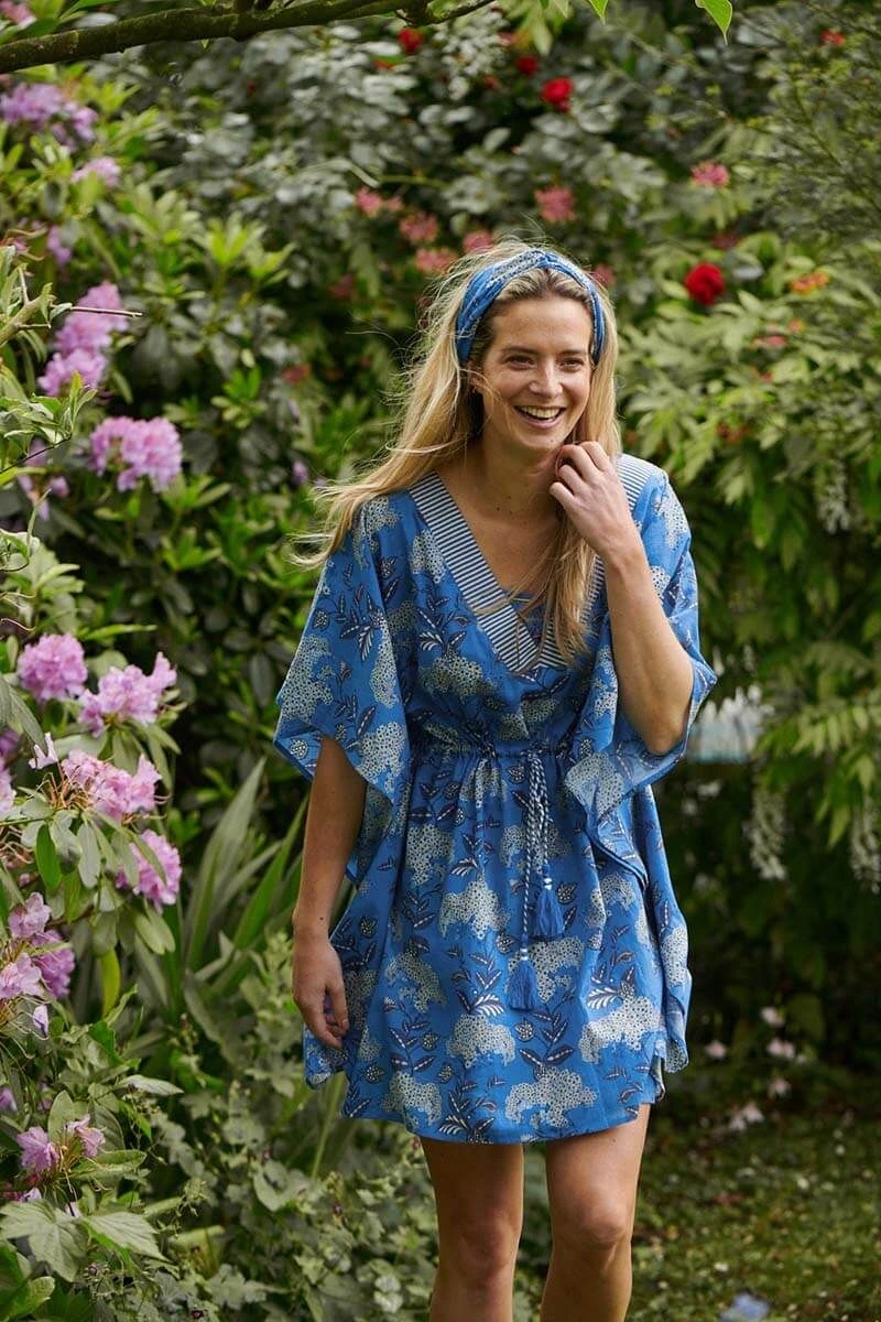 A short beach kaftan printed in a vibrant Flora Firenze floral print, made from soft cotton voile. The cobalt blue tunic has a drawstring and a V-neck, which is finished with the Little Sumo Stripe. Perfect for holidays in warm weather or as a beach cover-up on sunny beach days.