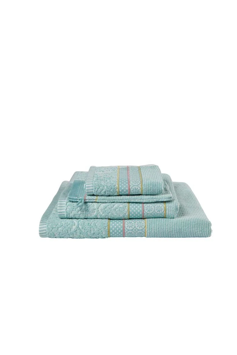 The Soft Zellige Wash cloths blue have a blue-white striped print. The sides feature two bands of piping in the colours pink and yellow. In between are two stylish floral prints on woven jacquard in the colours blue and white. The Soft Zellige bath linen series pairs beautifully with the other bath linen series by Pip Studio, which creates a lovely mix-and-match effect in your bathroom.