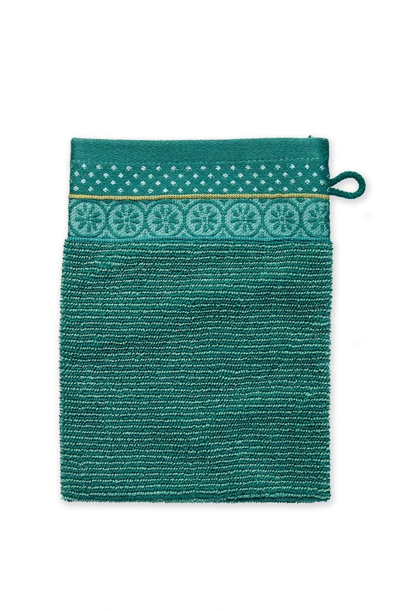 The Soft Zellige Wash cloths green have a darkblue-and-blue striped print. The sides feature two bands of piping in the colours bluegreen and yellow. In between are two stylish floral prints on woven jacquard in the colours darkblue and blue. The Soft Zellige bath linen series pairs beautifully with the other bath linen series by Pip Studio, which creates a lovely mix-and-match effect in your bathroom.