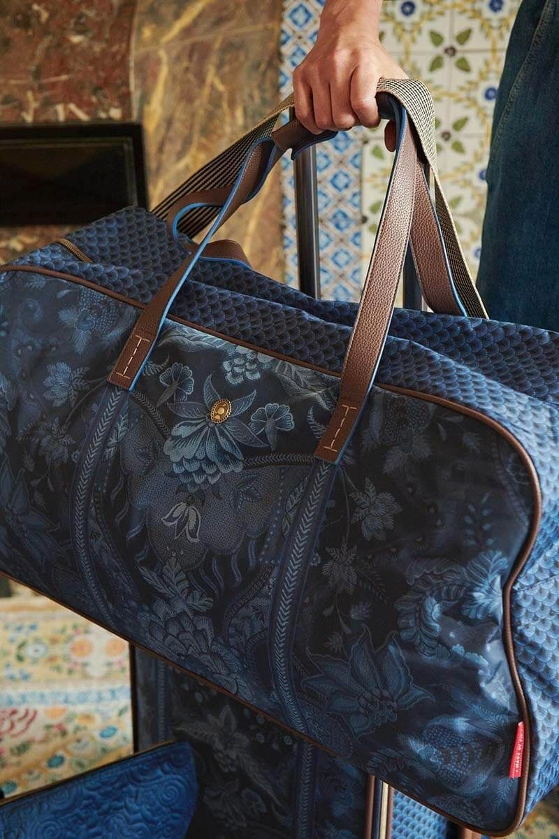 Got a holiday or weekend getaway planned? This handy travel bag is a must-have for bringing all your essentials with you. Not only is our large travel bag practical, but also a feast for the eyes. It is beautifully decorated with a unique variety of fanciful chintz flowers and leaves. Symmetrically placed flower branches with elaborately decorated flowers give the design a luxurious flair. The bag has a large storage compartment, zipper closure and extra small pockets on the inside, so you can keep all your important items within easy reach. Curious about matching bags? Check out our extensive bag collection.