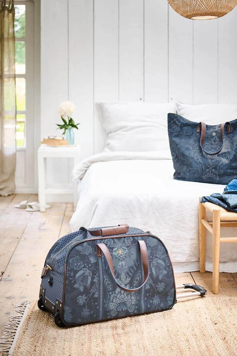 The new weekender on wheels in the color indigo blue with the Kyoto Fesitval design is a great addition to your wardrobe. This weekender has one large storage compartment for your clothes and shoes, in which you will find 3 side pockets. One with a zipper and two with an elastic band. The outer and inner material are water repellent, which makes it perfect for any weather forecast. In addition, you can turn the weekender into a weekender on wheels by taking out the handle from the storage compartment.