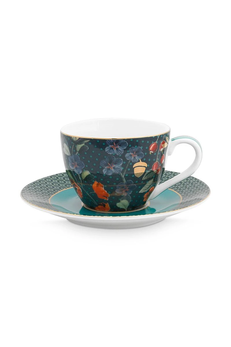A dark blue porcelain espresso cup & saucer from our Winter Wonderland collection. Decorated with a variety of berries, acorns and seasonal flowers, this set is perfectly sized for a single or double espresso. Each cup is decorated with luxurious elements, such as the gold finish on the handle.